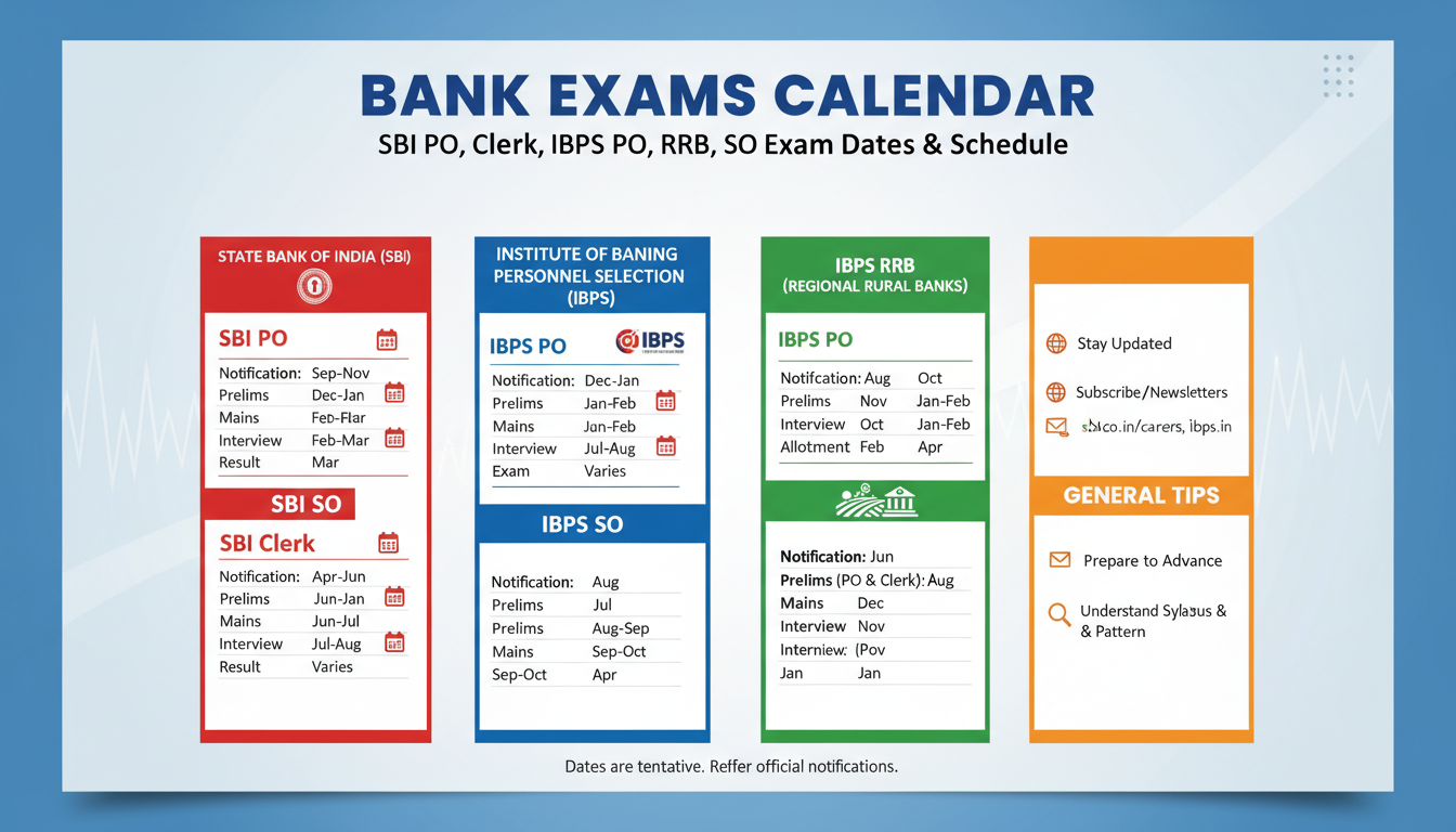 Here’s the 2025 exam schedule for major banking careers—SBI PO, SBI Clerk, IBPS PO, Clerk, Specialist Officer (SO), and Regional Rural Banks (RRBs). It covers prelims, mains, and key application dates, all in one glance for quick clarity.