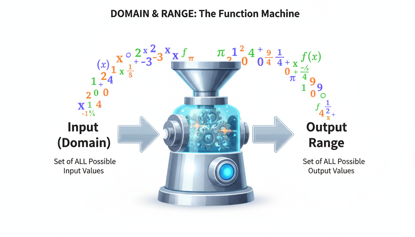 Imagine a vending machine—you can only feed it quarters or dollars (domain), and it dispenses soda flavors, not burgers (range). This analogy highlights that domain and range define the set of possible and permissible inputs and outputs.