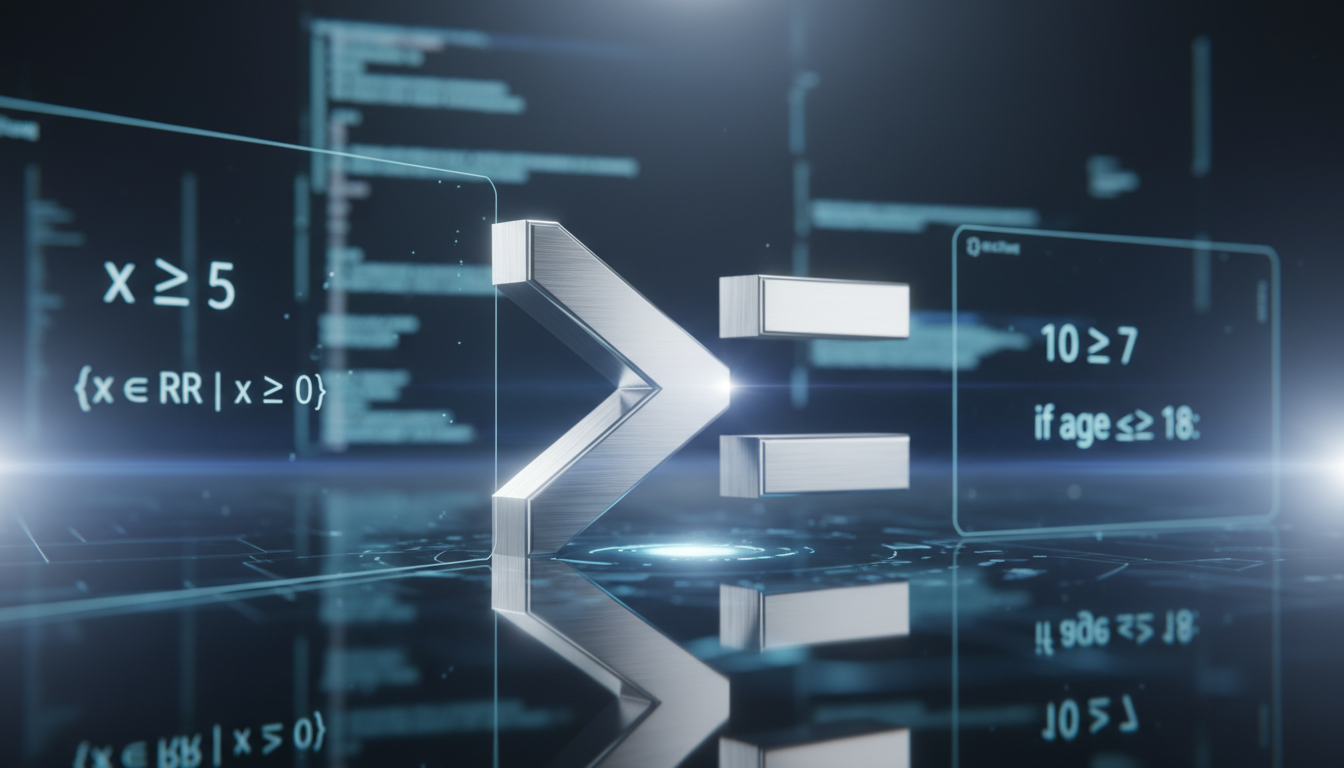 In code, >= is the practical twin of “≥”. It appears everywhere—from discount logic like if (cartTotal >= 50) to decide on free shipping, to numeric loops like while (i >= 0). It’s a control flow staple. Sometimes, though, buggy logic arises when developers accidentally use strictly greater (>) or mix up floating point quirks, like 0.1 + 0.2 >= 0.3 failing due to precision weirdness. So, knowing the symbol’s intent matters—and coding edge cases, too.