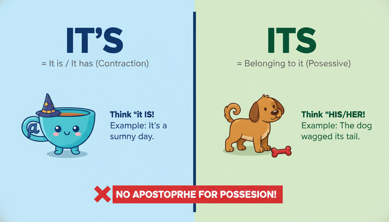 A quick sanity-check trick: expand “it’s” to “it is” or “it has.” If it makes sense, the apostrophe belongs. If not, you need “its.” For example: