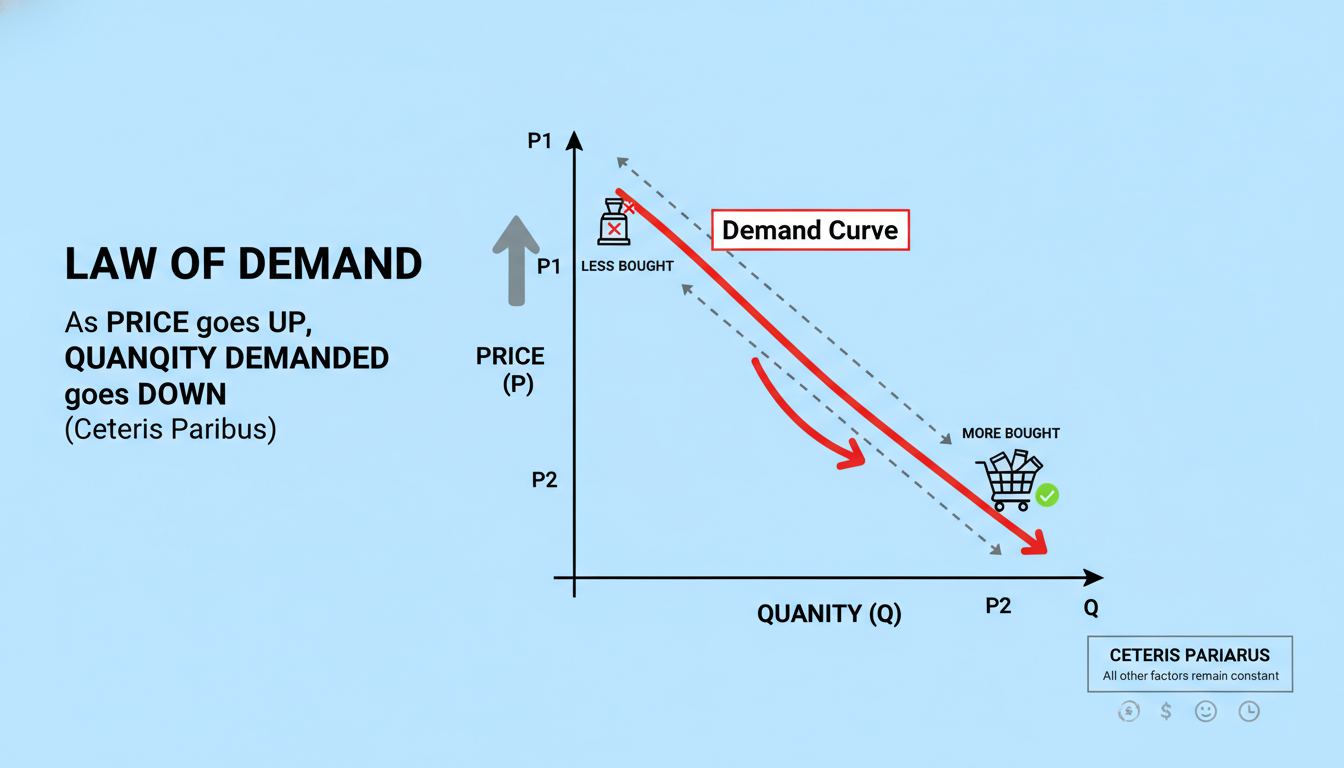 In plain terms, when prices go down, people buy more; when prices go up, they buy less. But real-world quirks like substitutions, income effects, or prestige can shape how strongly this plays out.