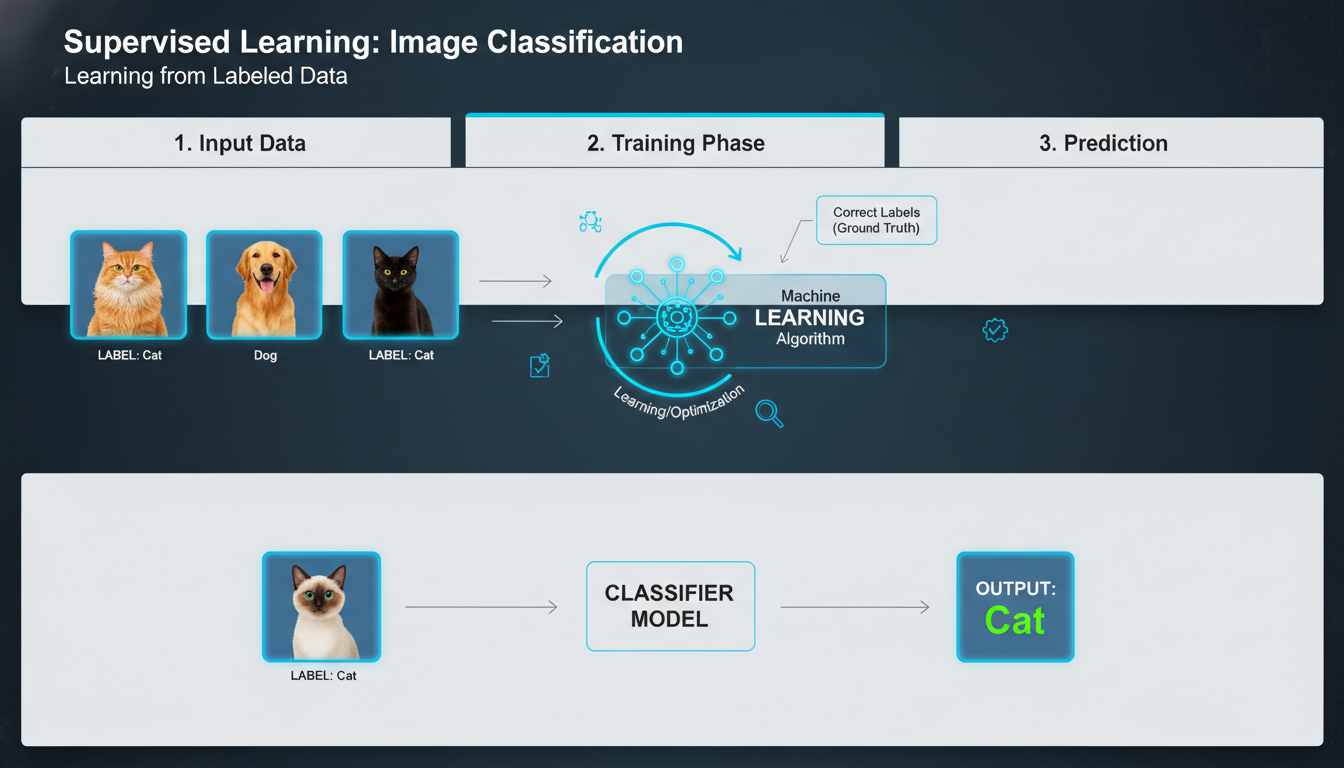 Supervised learning is exactly what it sounds like: teaching a model with labeled data. You tell it, “Here’s a cat, here’s not-a-cat,” and after many examples, it generalizes.