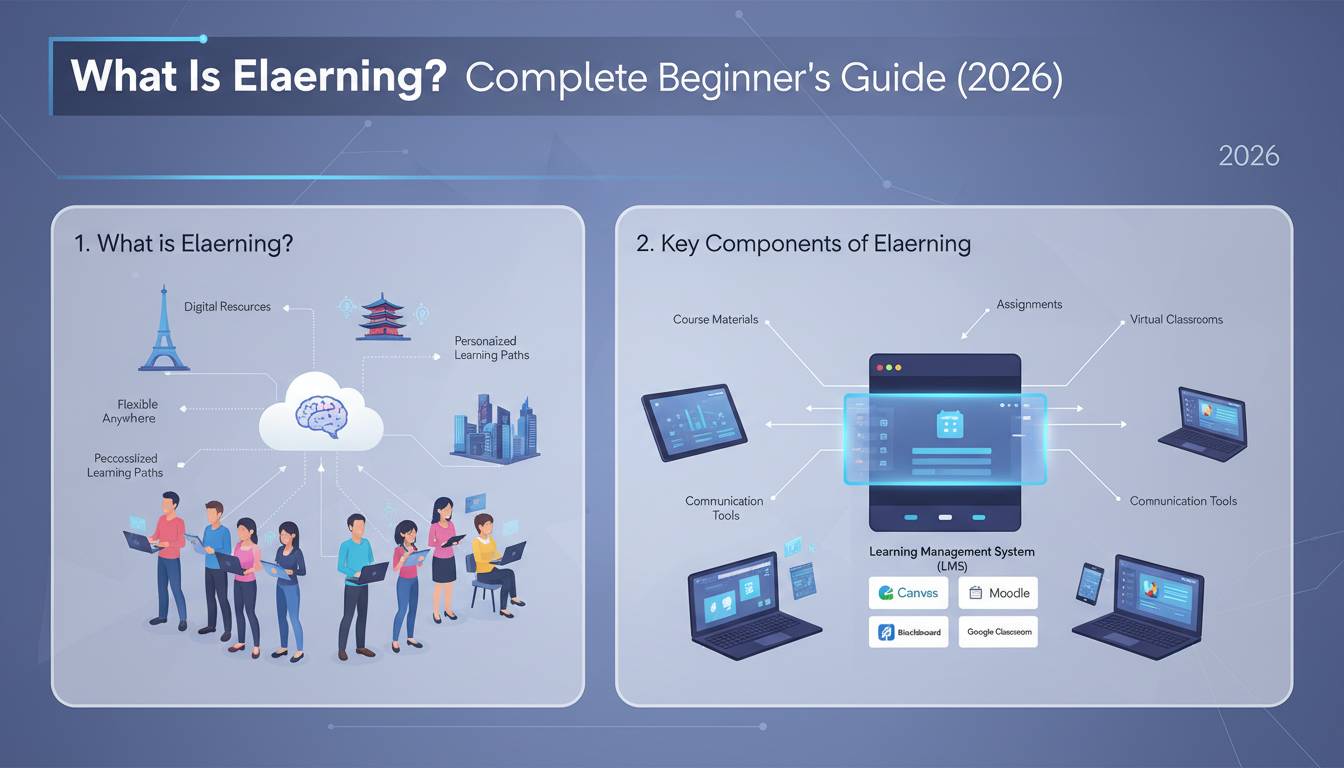 eLearning means learning that’s delivered through digital technology. You can access training and knowledge on computers, tablets, or phones. Unlike sitting in a classroom, eLearning lets you learn when it fits your schedule, at your own pace, often from anywhere with internet. This guide covers what eLearning means in 2026, the different types available, why it matters, the tools that make it work, and where it’s headed.